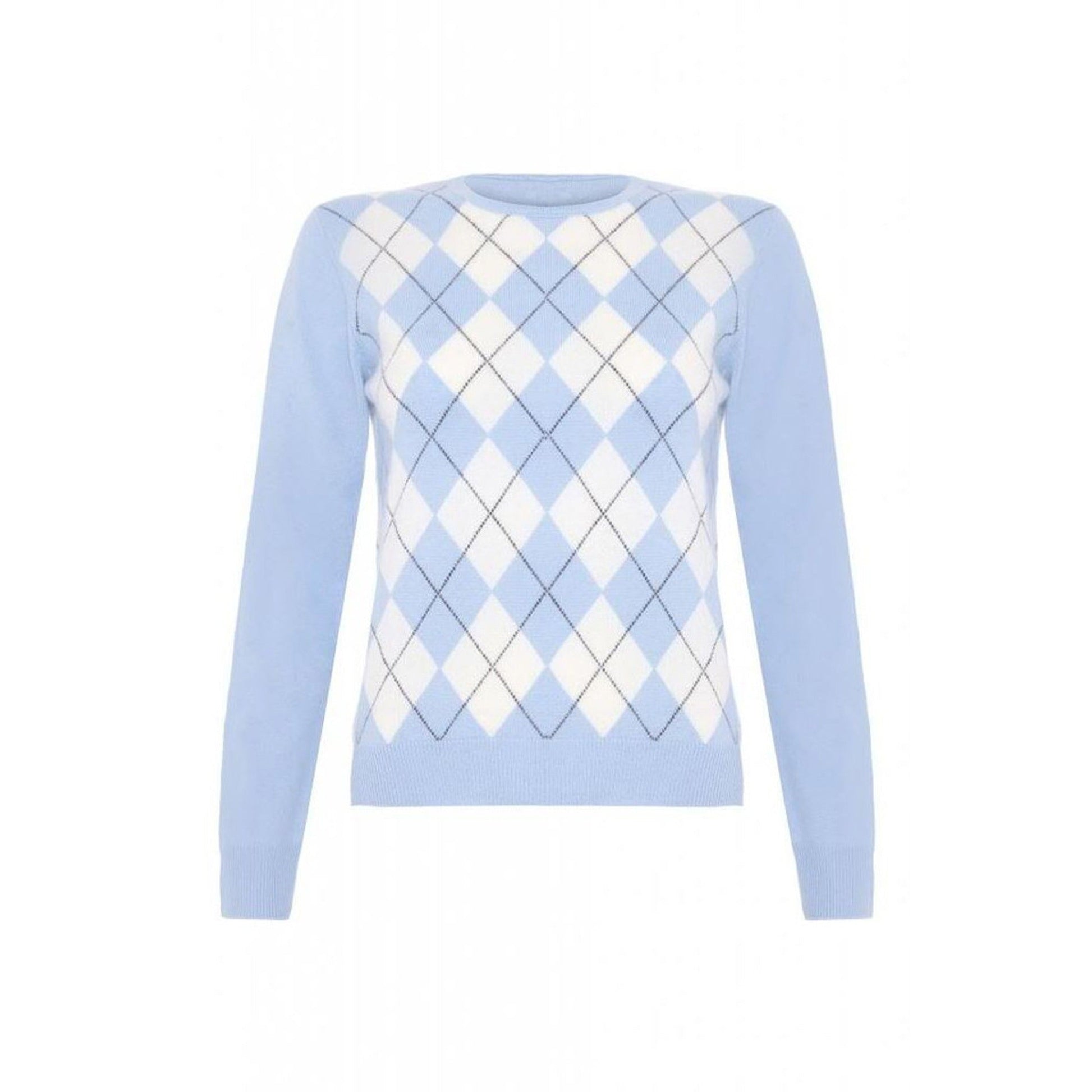 Discover timeless sophistication with our stylish Light Blue Argyle Round-Neck Jumper, designed with white diamonds and structured blue lines. Style it with a pair of dark or light denim for everyday wear or suit pants for a comfortable office attire- Contents: 100% Cashmere | Argyle 2 ply | Regular fit