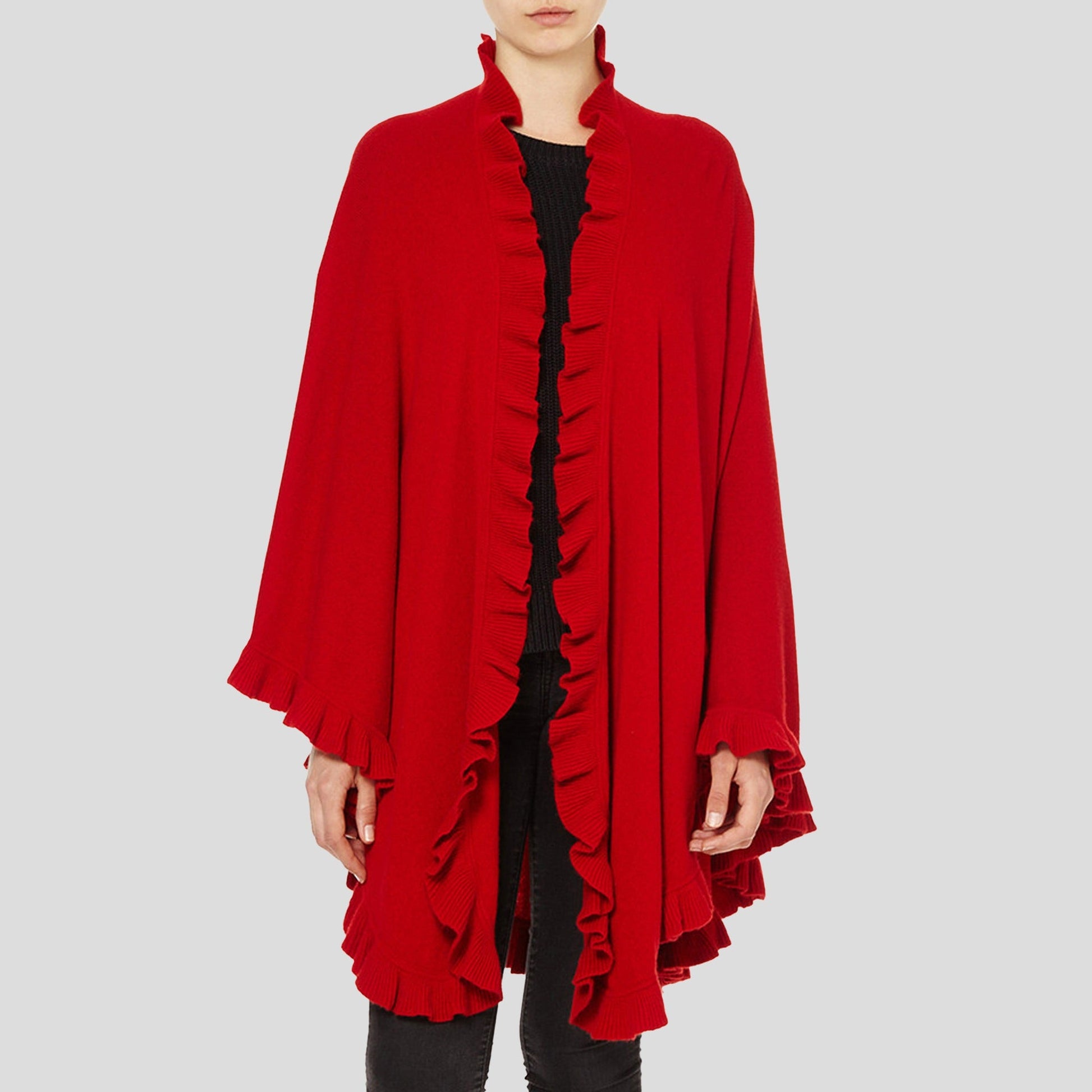 Add a dash of style to your winter wardrobe with this Cashmere Frilly Cape in Red. Soft against the skin, this long Cashmere Cape with frilly trim detail is made from the finest cashmere fibres that will add elegance and comfort to any outfit- Contents: 100% Cashmere | Frill Trim | One Size
